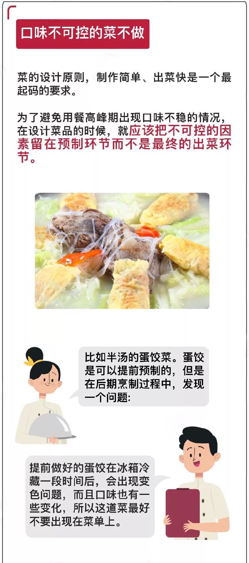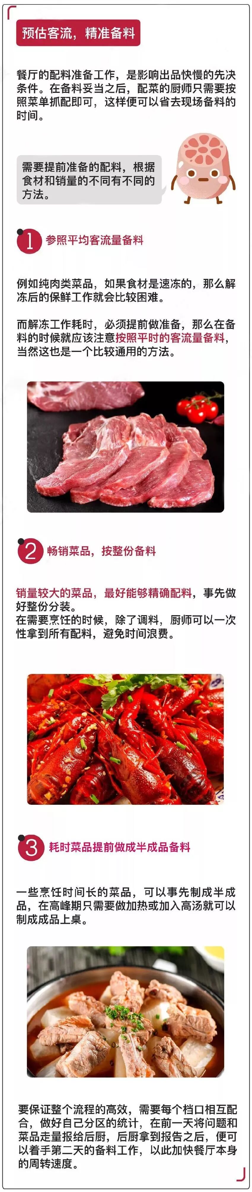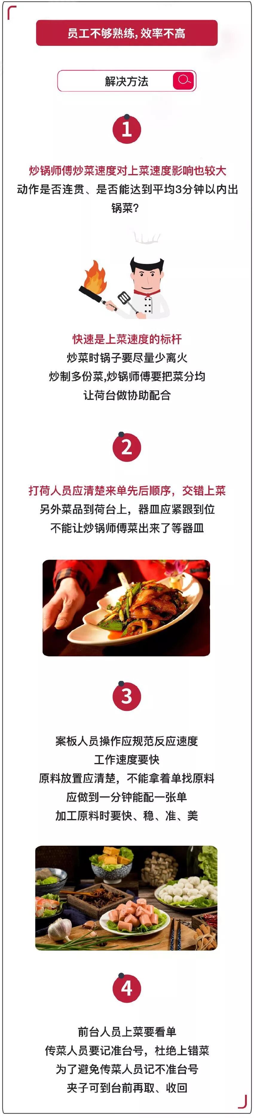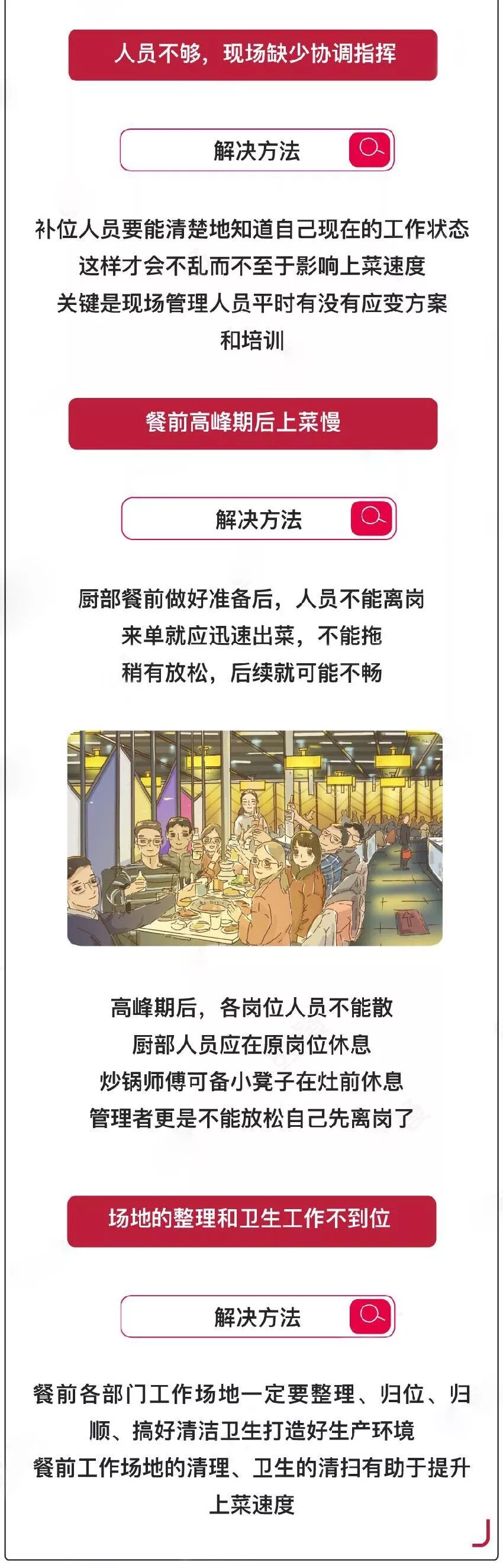 總的來說,出品速度其實是一個系統化的過程,與餐廳工作的協調溝通以及廚房的工作流程有關。餐廳解決上菜慢的根本方法,主要還是要加強科學預見性做好當天客流的預估,精準備料,同時加強員工的責任心,才能前廳后廚有效協作。