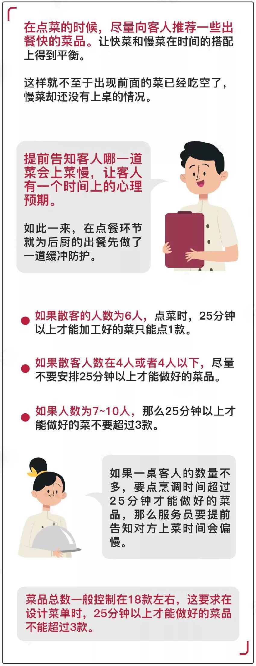 雖然現在很多餐單上都會注明菜品的烹飪時間,但客人往往還是會點一些做法復雜的菜,但因做法繁瑣而遲遲不上菜,并不會得到客人的理解,依然會給客人留下出餐慢的印象,這時就需要服務員在客人點菜的時候做好引導。