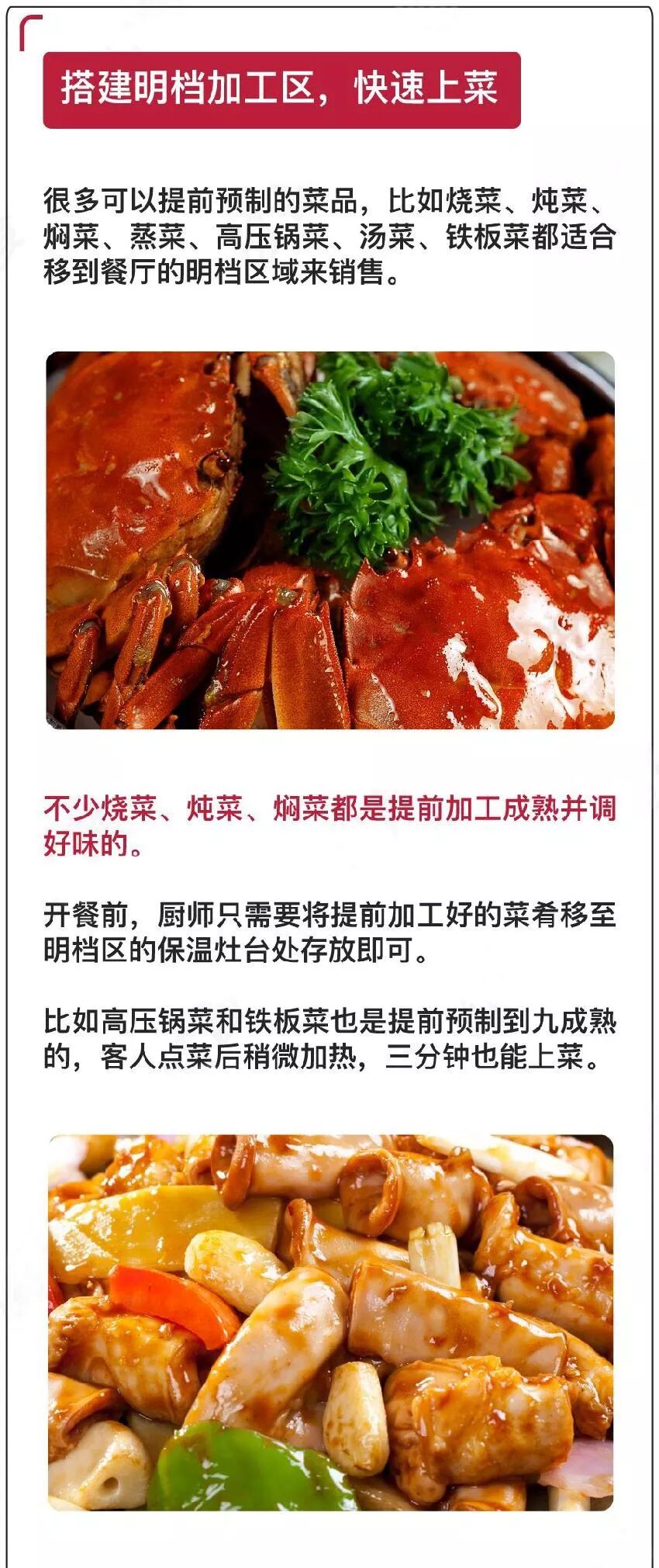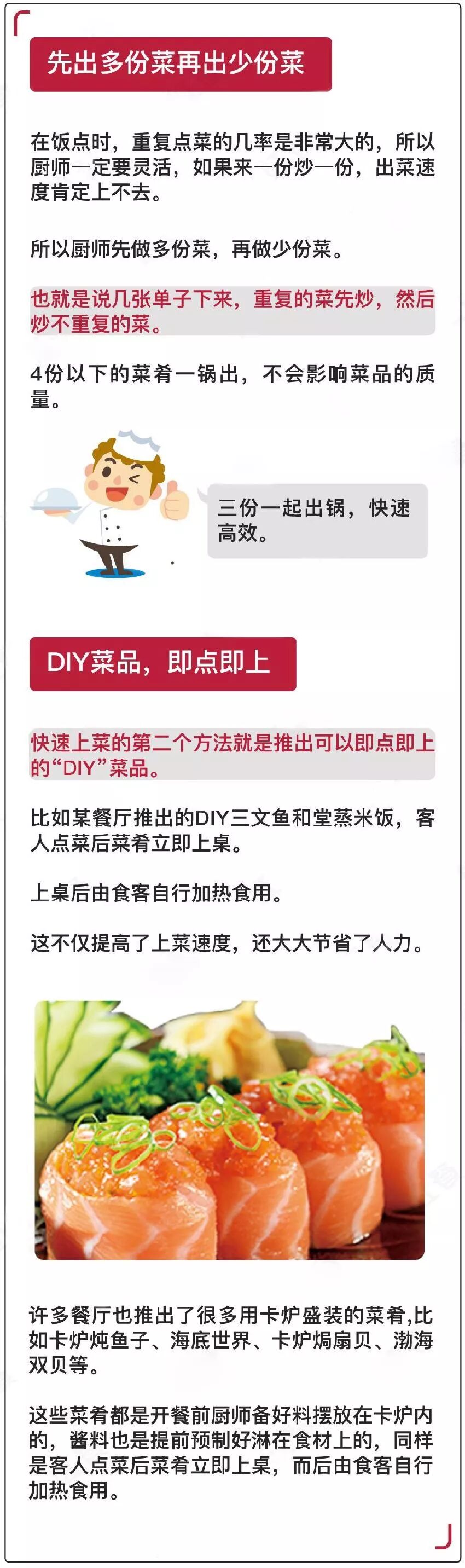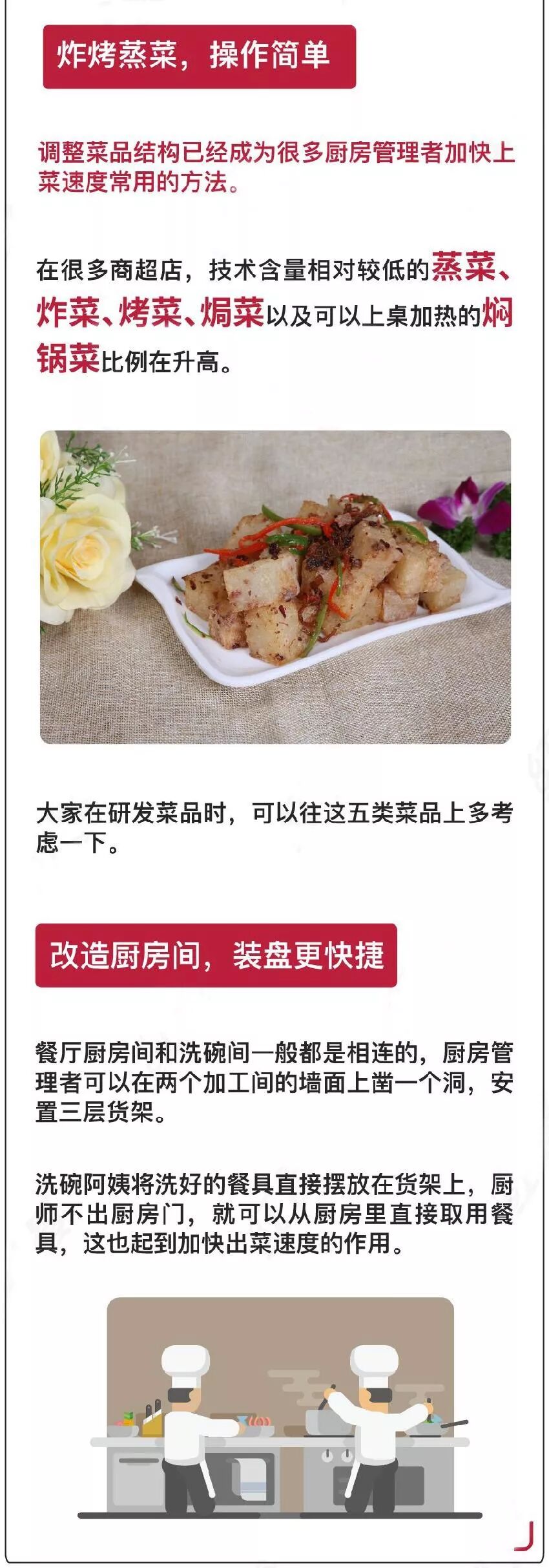 至于縮短上菜時間的難度會更大,畢竟從下單到上菜整個過程需要前廳和后廚配合,涉及到服務員、傳菜員及后廚等多方面的協調。有人說老板多花錢多請一些人就行了,話是這么說,但是后廚就那么大,可以容納的廚師就那么多,還有成本在那里,老板也不是傻子。