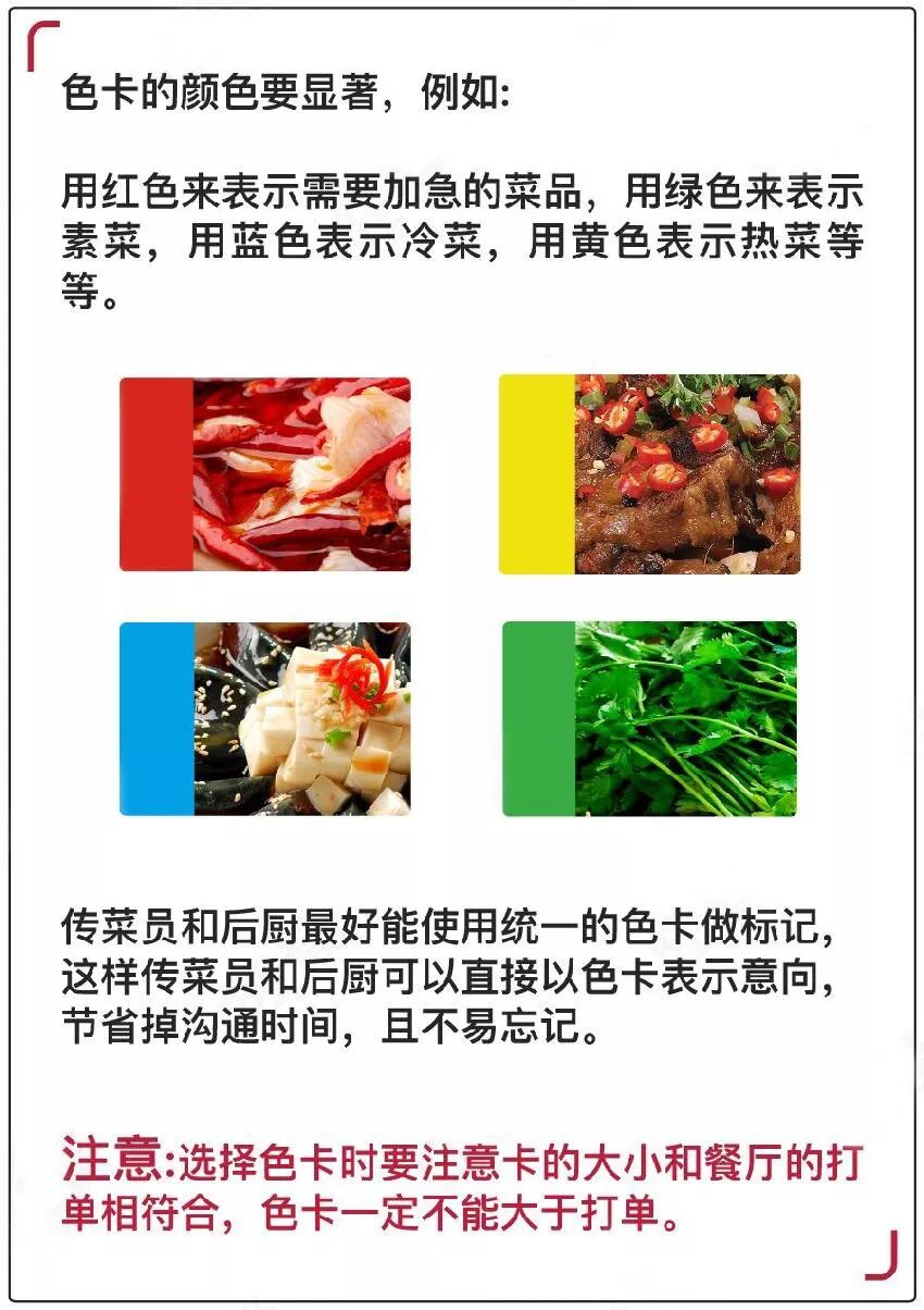 通過不同顏色的色卡設置,讓傳菜員在拿到餐單的**時間,就可以根據不同顏色的色卡區分菜品的應上菜速度。